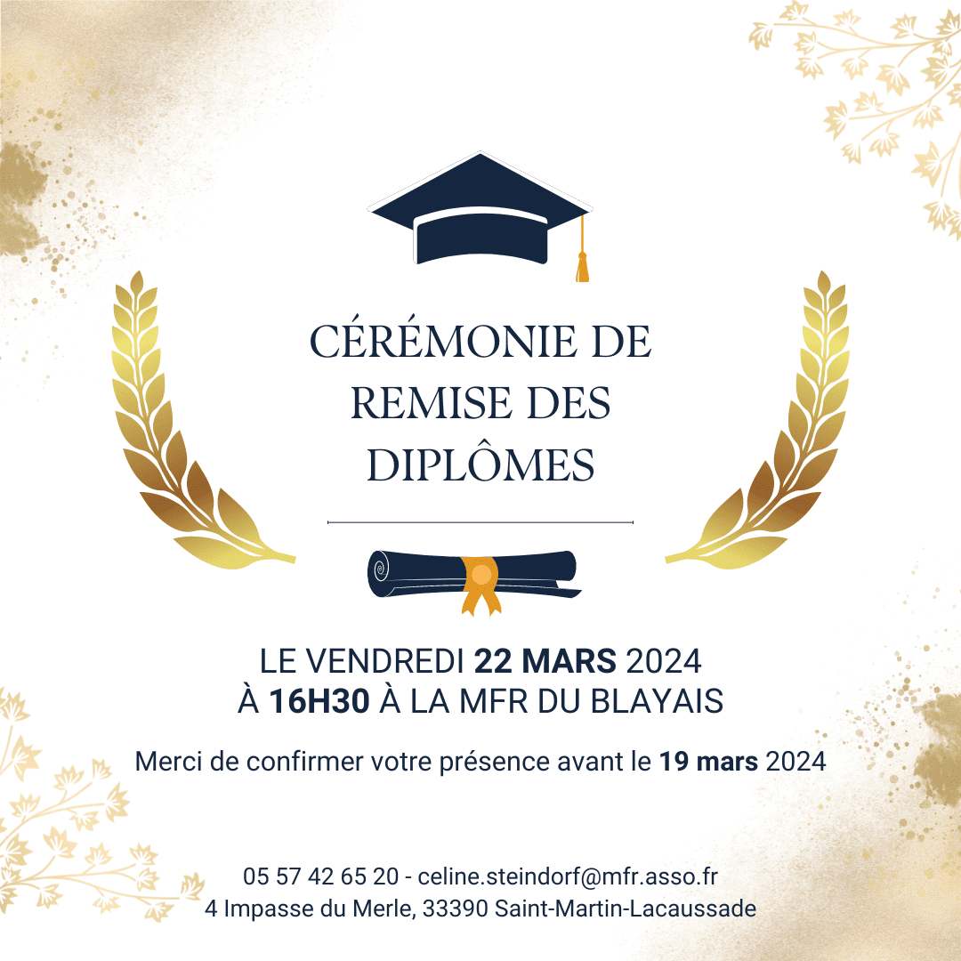 Le vendredi 22 mars la MFR du Blayais organise une remise des diplômes de 16h30 à 17h30 pour tous les élèves de la formation professionnelle ayant eu leur diplôme en 2023 !