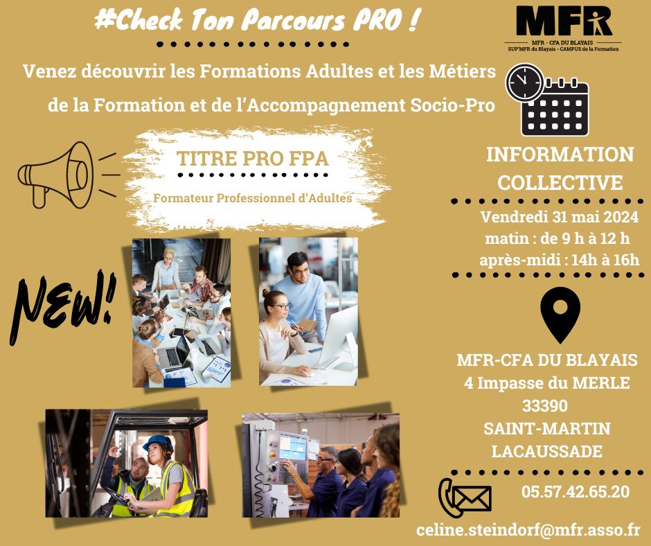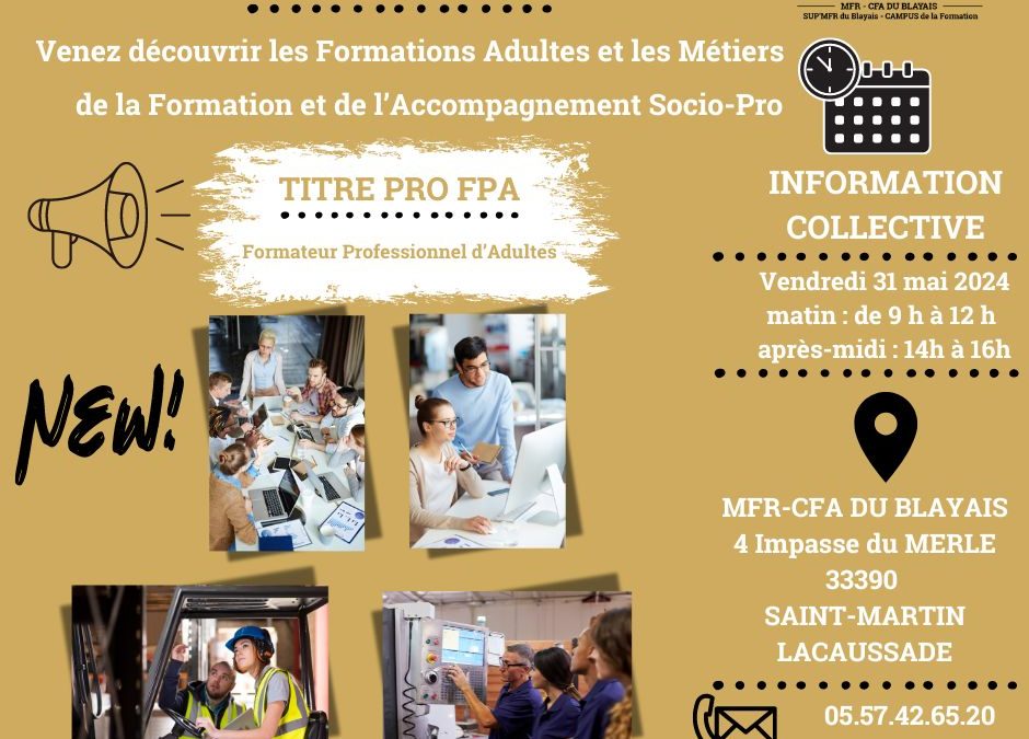 La MFR-CFA du Blayais organise une information collective le vendredi 31 mai prochain de 9h à 12h pour la matinée et de 14h à 16h l’après-midi à la MFR du Blayais !Â